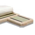 With its structure made of solid laminated beech wood with no metal parts (Magnetic Free), it is an environmentally friendly and beautifully designed piece of furniture. The bed structure can also be much wider than the mattress, forgoing bedside tables and emphasizing tatami (laid on a slatted base).