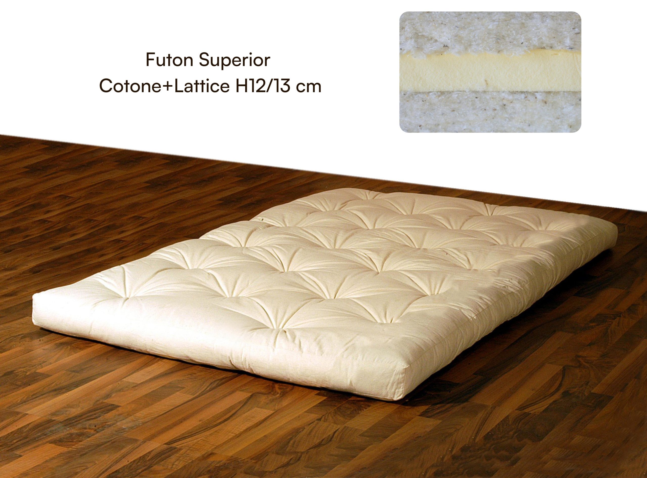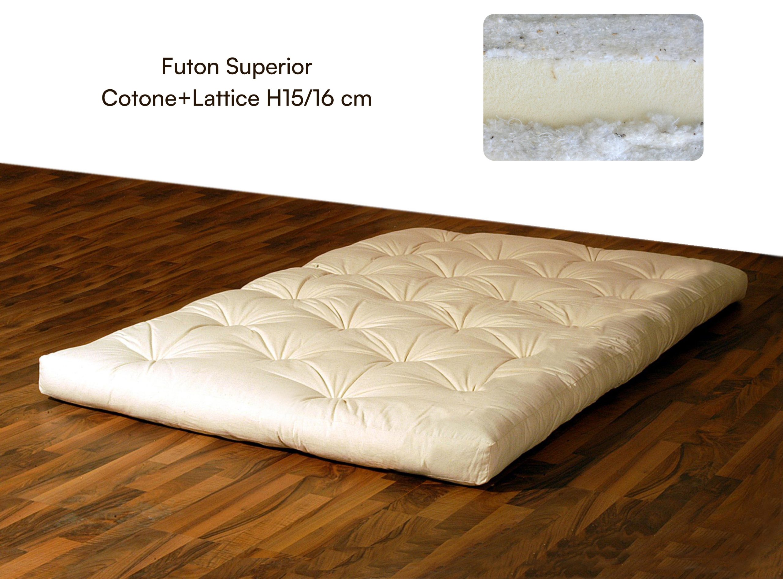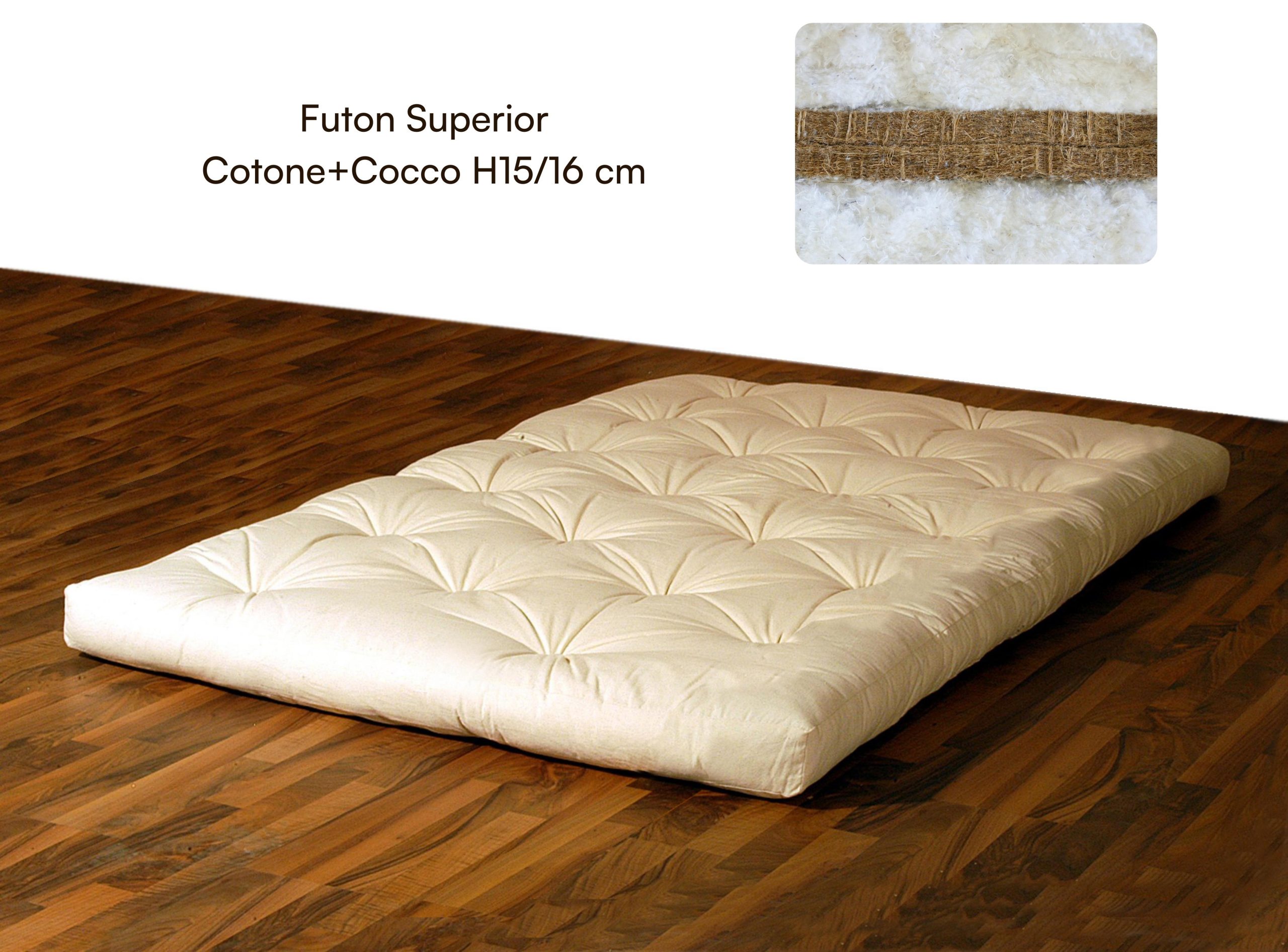 Le futon japonais original n’était fait que de coton. Cependant, étant donné qu’en Occident nous n’avons pas l’habitude de nous rouler et de frapper le matelas fréquemment, il arrive souvent que le futon devienne trop rigide. C’est pourquoi nous produisons également des futons avec des inserts en latex appelés « Futon Lattice » qui prolongent les performances orthopédiques du matelas en réduisant la nécessité de rouler et de plier le futon. Tous les Futons Cinius sont équipés d’une fermeture éclair d’inspection. Entretien futon Le futon est un matelas non déhoussable, donc toutes les taches doivent être traitées avec des détachants. Il ne faut pas utiliser d’eau ou de chiffons humides, car le rembourrage en coton contient des particules de feuilles qui, si elles sont mouillées, pourraient teindre le tissu. C’est une bonne norme hygiénique de passer périodiquement l’aspirateur sur le futon. Le futon doit être tourné souvent dans les premiers mois d’utilisation, pour permettre un lissage uniforme du coton. Pendant les périodes particulièrement humides, à l’humidité naturelle émise par notre corps s’ajoute l’humidité ambiante : il est conseillé de laisser les fenêtres ouvertes et, si possible, de placer le matelas de sorte qu’il prenne de l’air des deux côtés. Si le futon repose sur les tatamis, il est essentiel d’éviter l’accumulation d’humidité entre eux : il est conseillé de laisser périodiquement le matelas enroulé ou recueilli, surtout pendant les périodes humides.