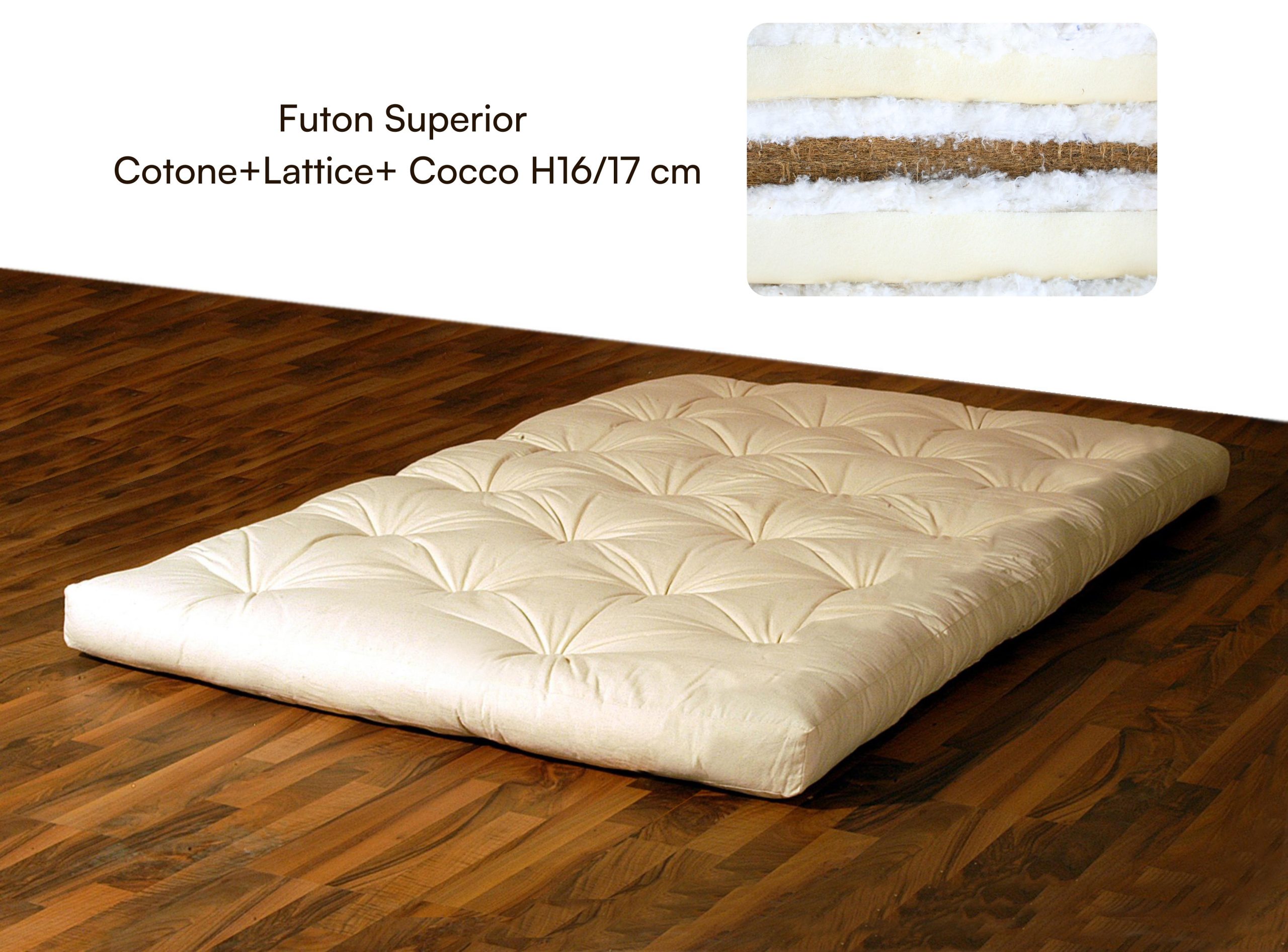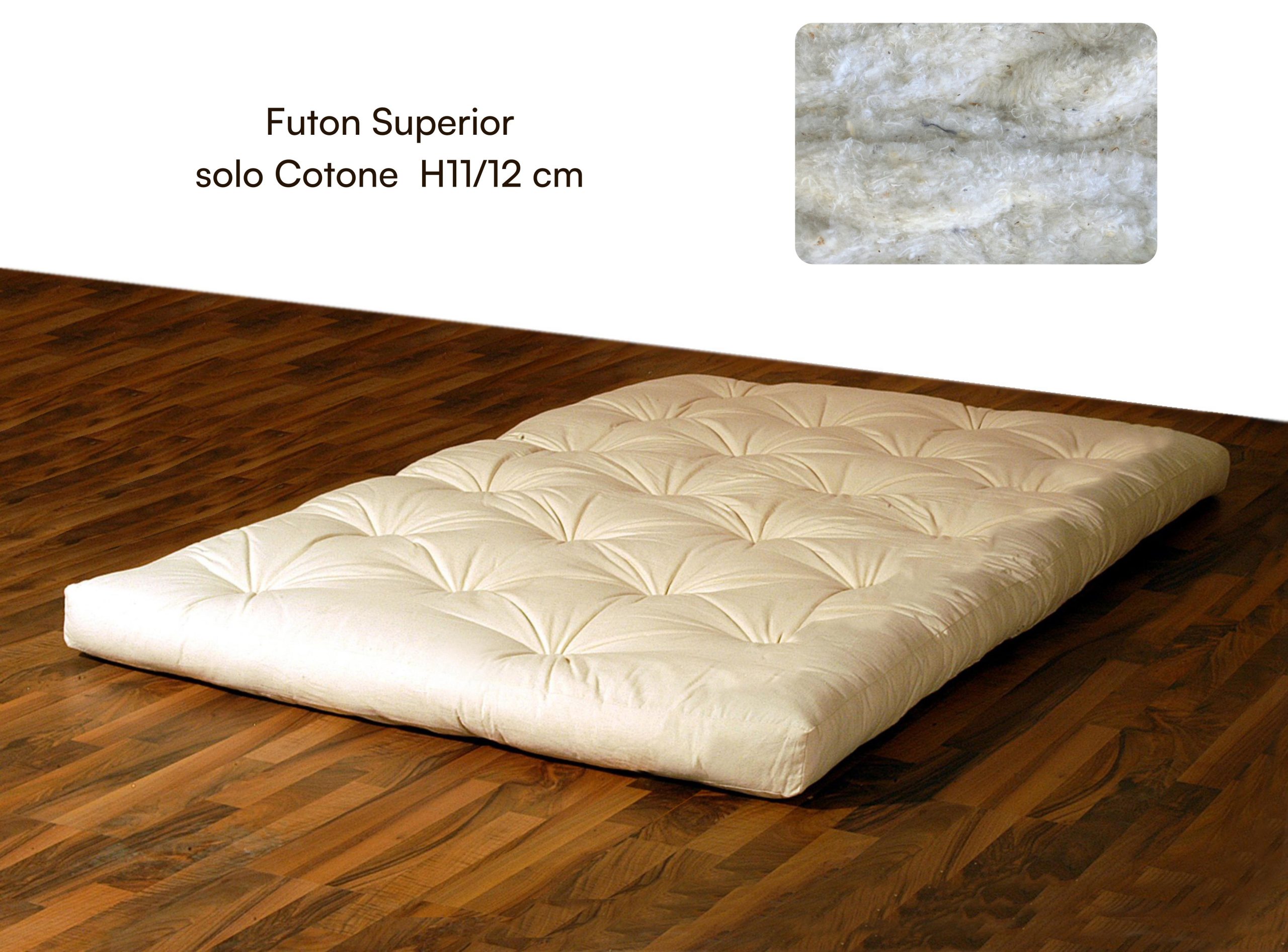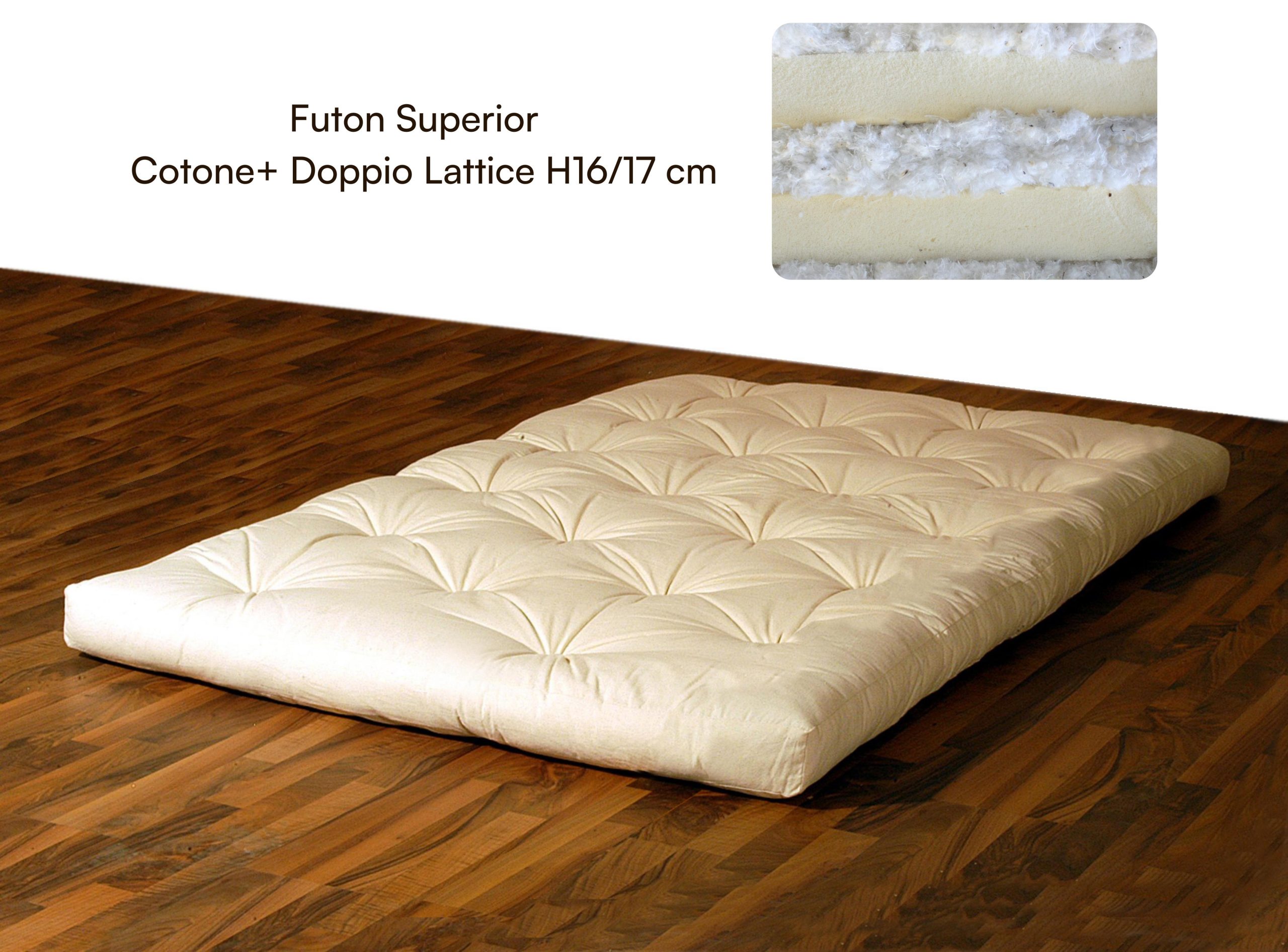 Le futon japonais original n’était fait que de coton. Cependant, étant donné qu’en Occident nous n’avons pas l’habitude de nous rouler et de frapper le matelas fréquemment, il arrive souvent que le futon devienne trop rigide. C’est pourquoi nous produisons également des futons avec des inserts en latex appelés « Futon Lattice » qui prolongent les performances orthopédiques du matelas en réduisant la nécessité de rouler et de plier le futon. Tous les Futons Cinius sont équipés d’une fermeture éclair d’inspection. Entretien futon Le futon est un matelas non déhoussable, donc toutes les taches doivent être traitées avec des détachants. Il ne faut pas utiliser d’eau ou de chiffons humides, car le rembourrage en coton contient des particules de feuilles qui, si elles sont mouillées, pourraient teindre le tissu. C’est une bonne norme hygiénique de passer périodiquement l’aspirateur sur le futon. Le futon doit être tourné souvent dans les premiers mois d’utilisation, pour permettre un lissage uniforme du coton. Pendant les périodes particulièrement humides, à l’humidité naturelle émise par notre corps s’ajoute l’humidité ambiante : il est conseillé de laisser les fenêtres ouvertes et, si possible, de placer le matelas de sorte qu’il prenne de l’air des deux côtés. Si le futon repose sur les tatamis, il est essentiel d’éviter l’accumulation d’humidité entre eux : il est conseillé de laisser périodiquement le matelas enroulé ou recueilli, surtout pendant les périodes humides.